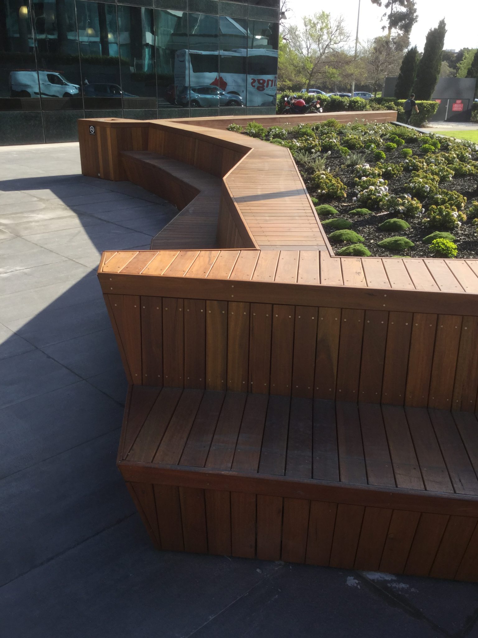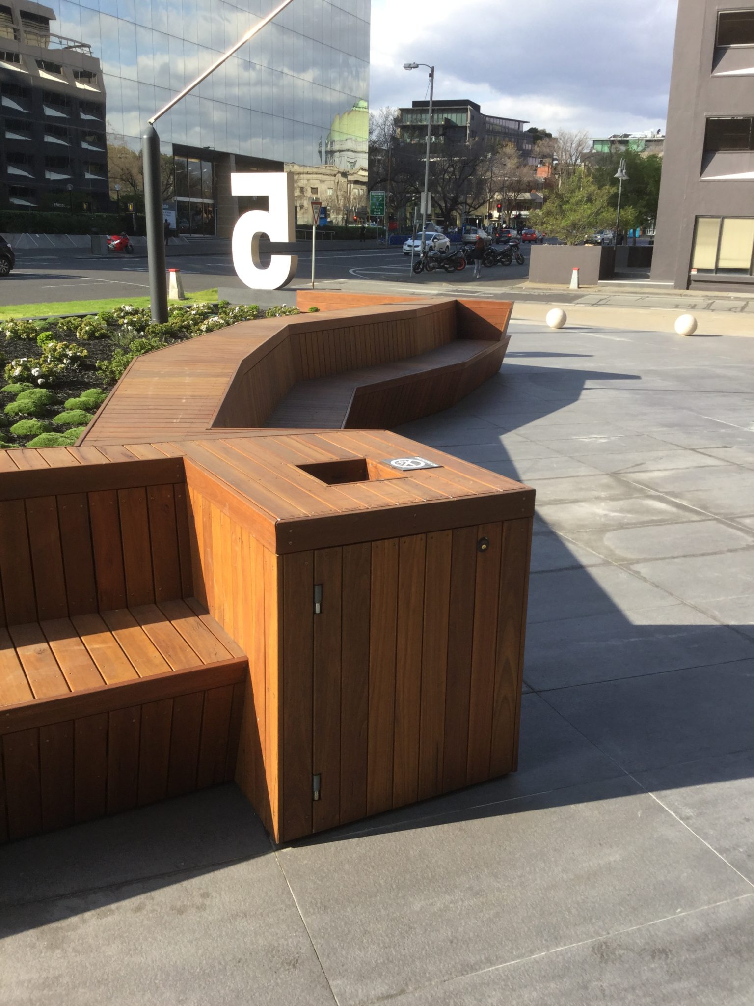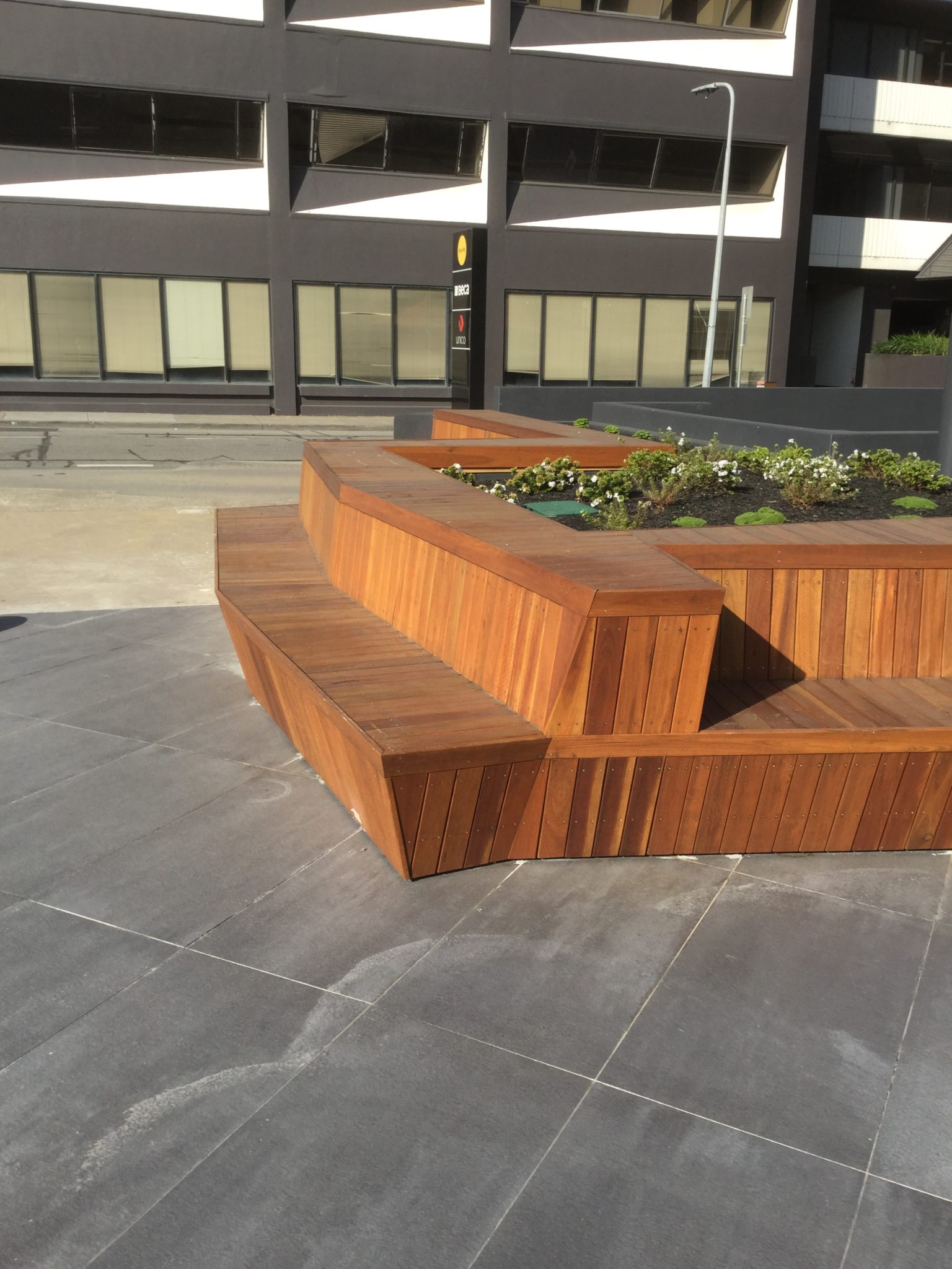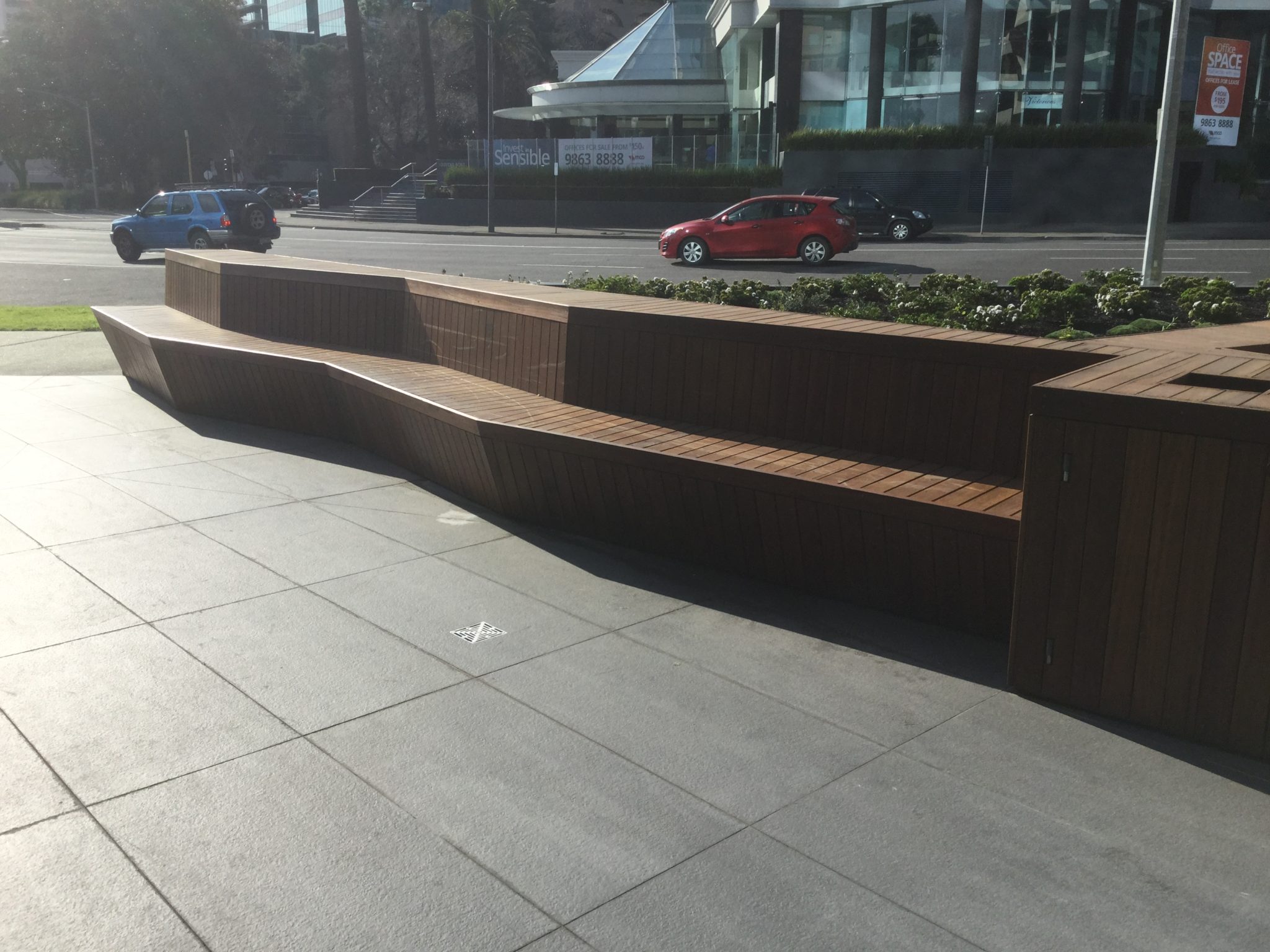 Architecturally detailed spotted gum seating for a public-access commercial space.