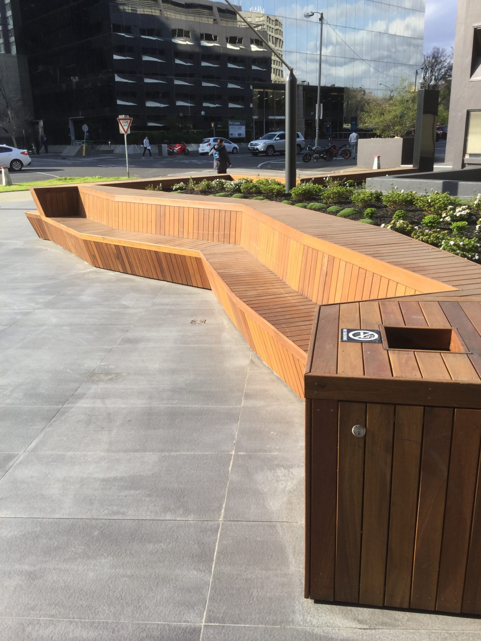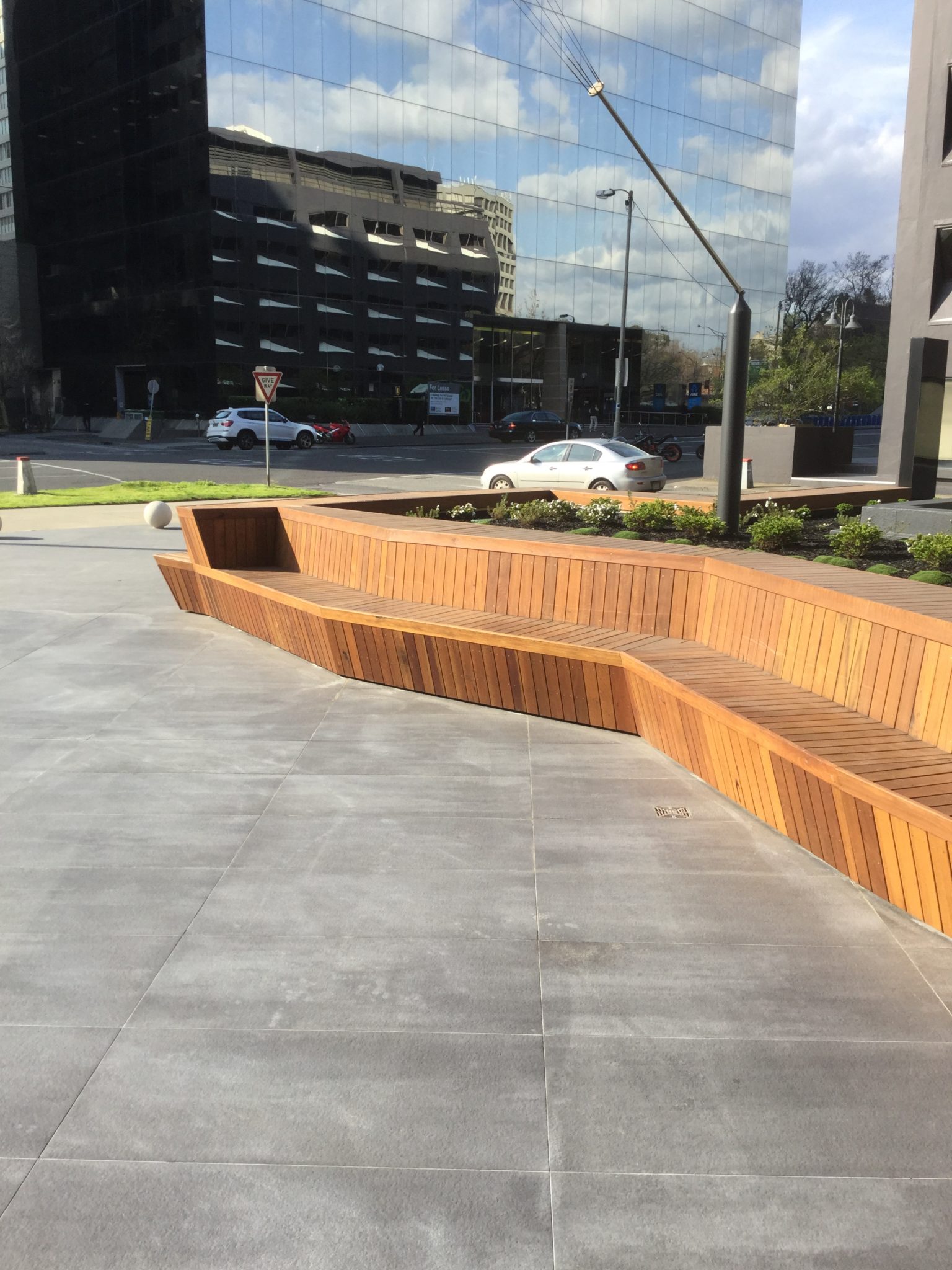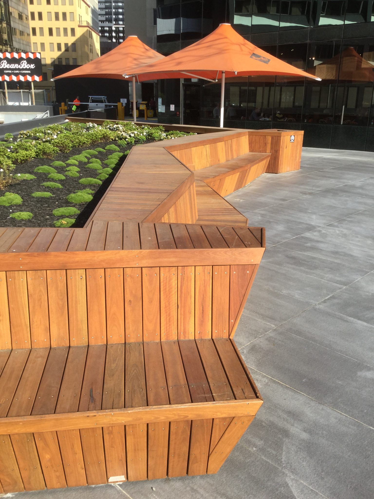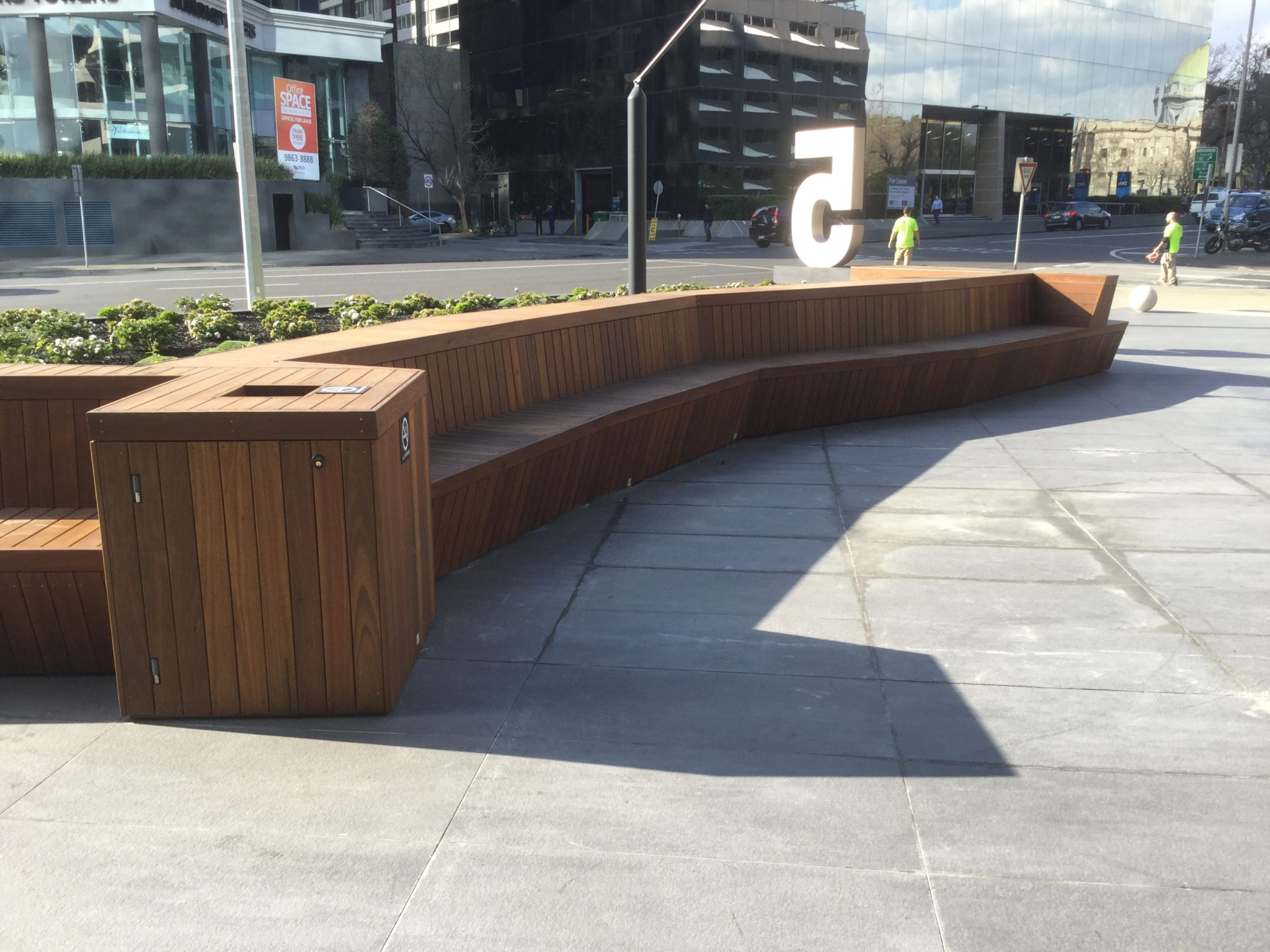 Architecturally detailed spotted gum seating for a public-access commercial space.