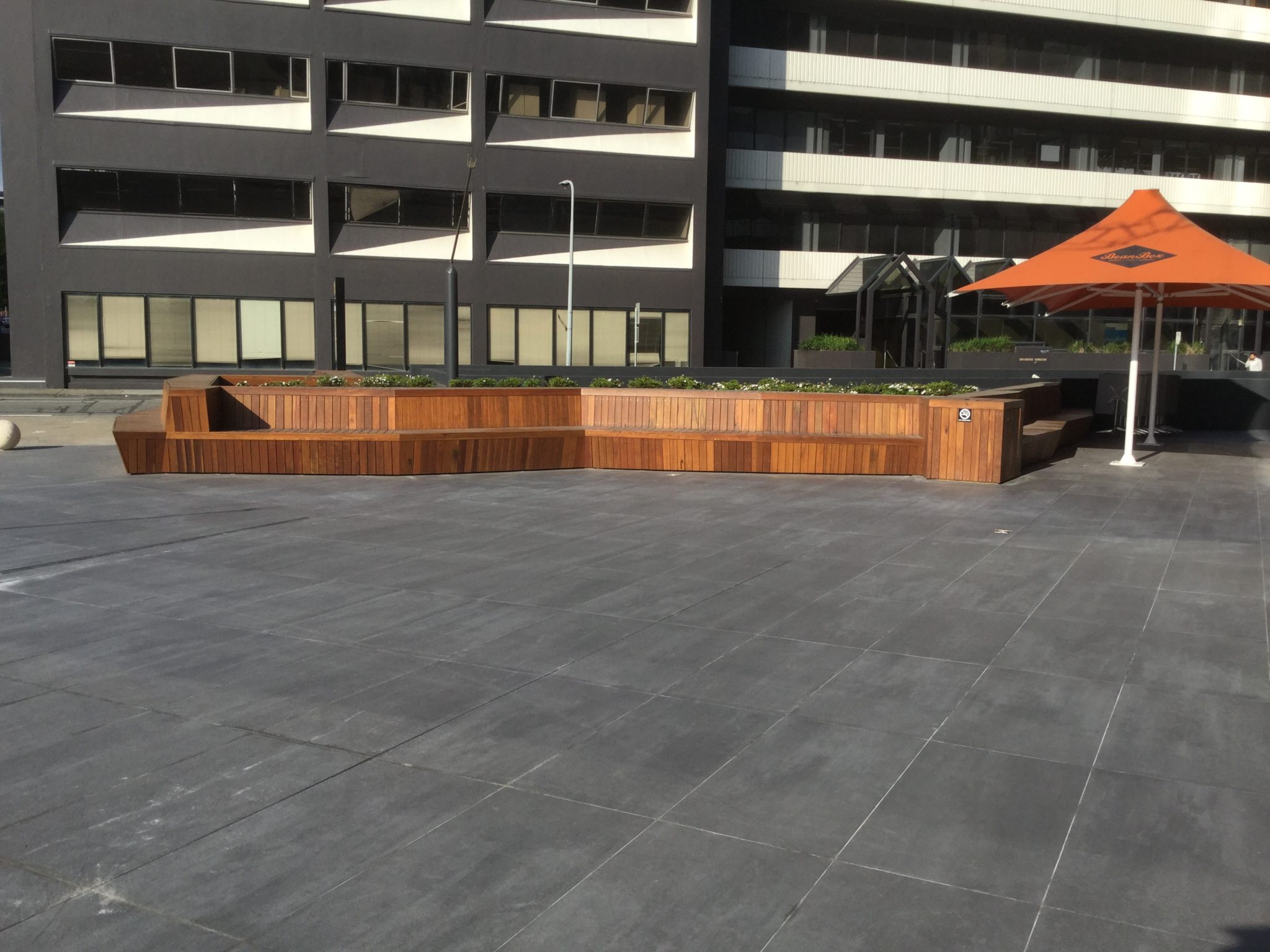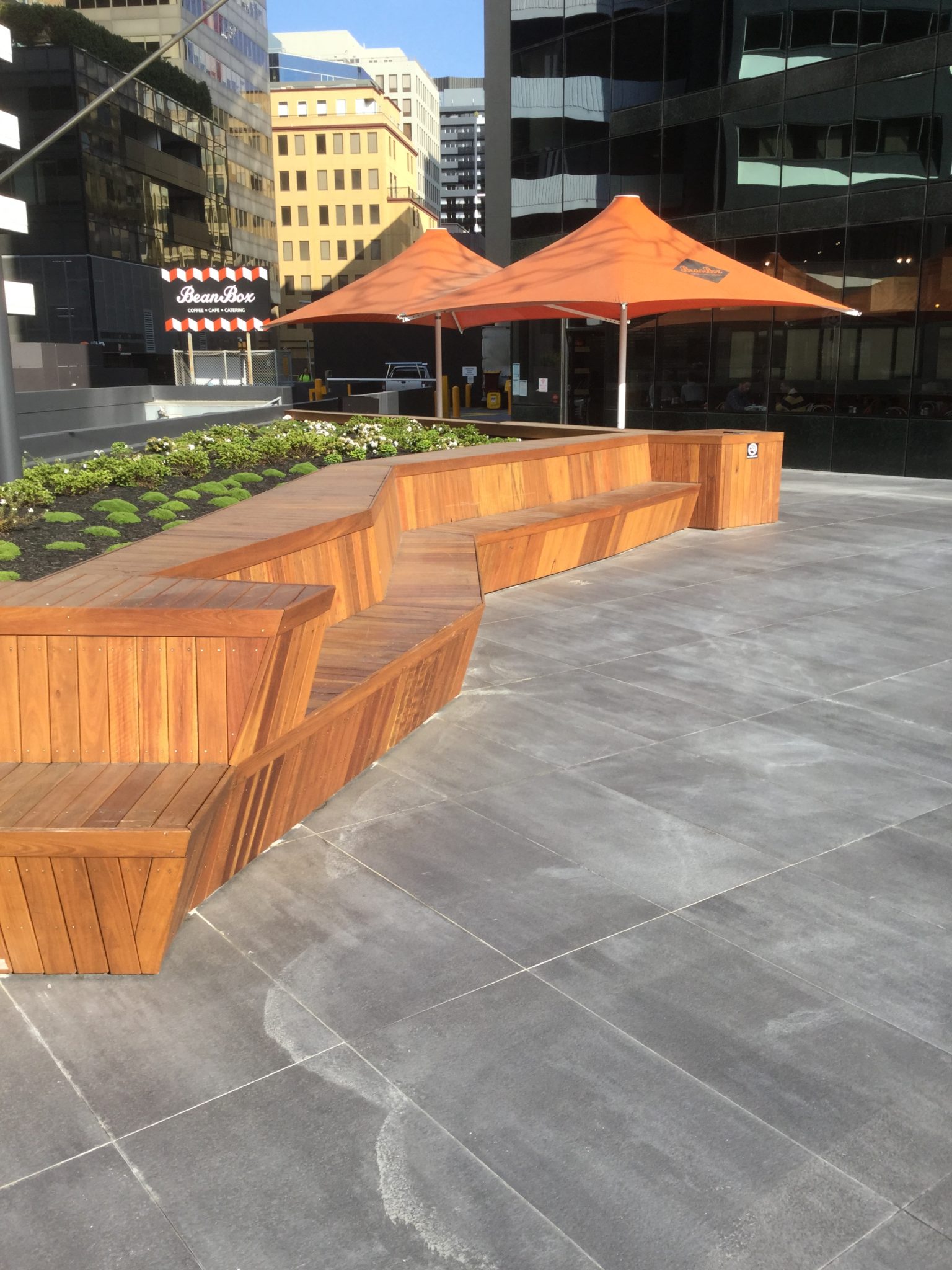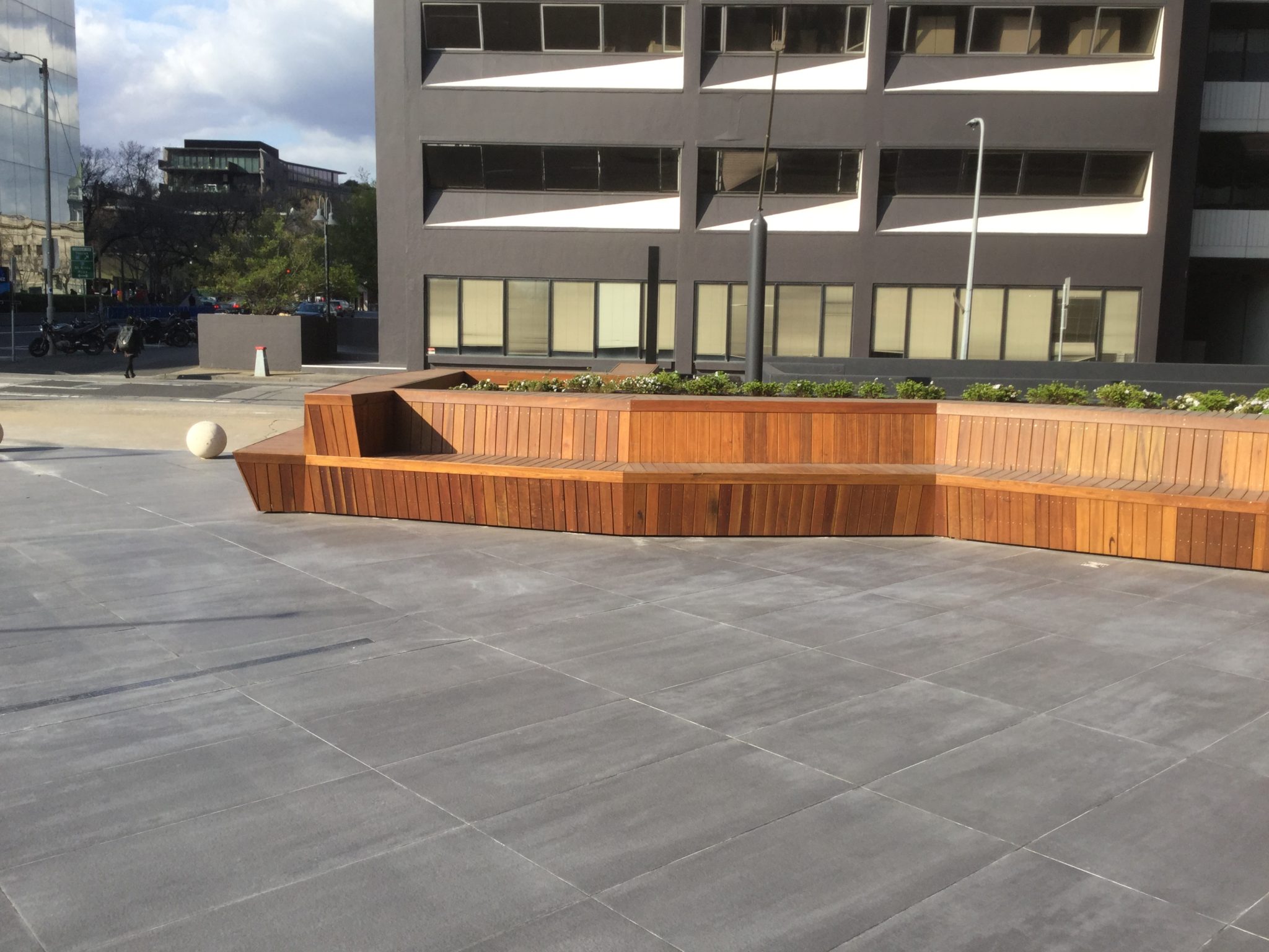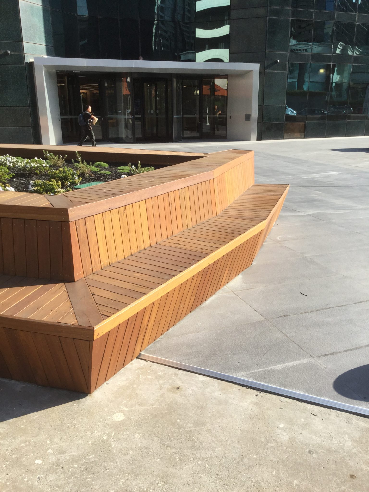 Architecturally detailed spotted gum seating for a public-access commercial space.